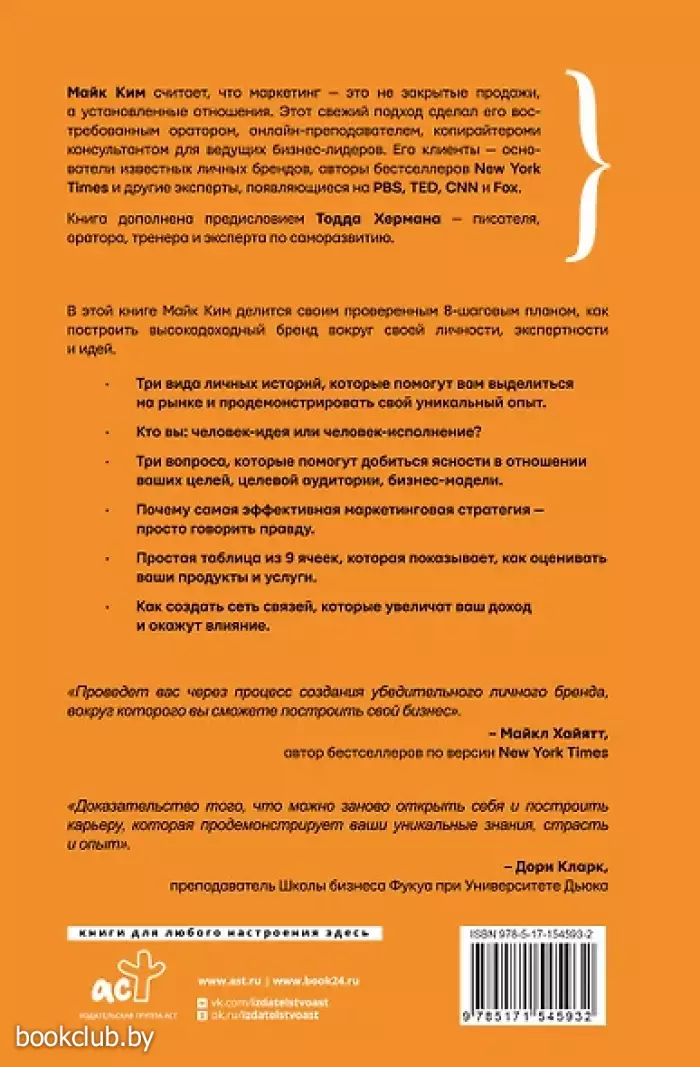 Майк Ким считает, что маркетинг — это не закрытые продажи, а установленные отношения. Этот свежий подход сделал его востребованным оратором, онлайн-преподавателем, копирайтером и консультантом для ведущих бизнес-лидеров. Его клиенты – основатели известных личных брендов, авторы бестселлеров New York Times и другие эксперты, появляющиеся на PBS, TED, CNN и Fox. Книга дополнена предисловием Тодда Хермана — писателя, оратора, тренера и эксперта по саморазвитию.