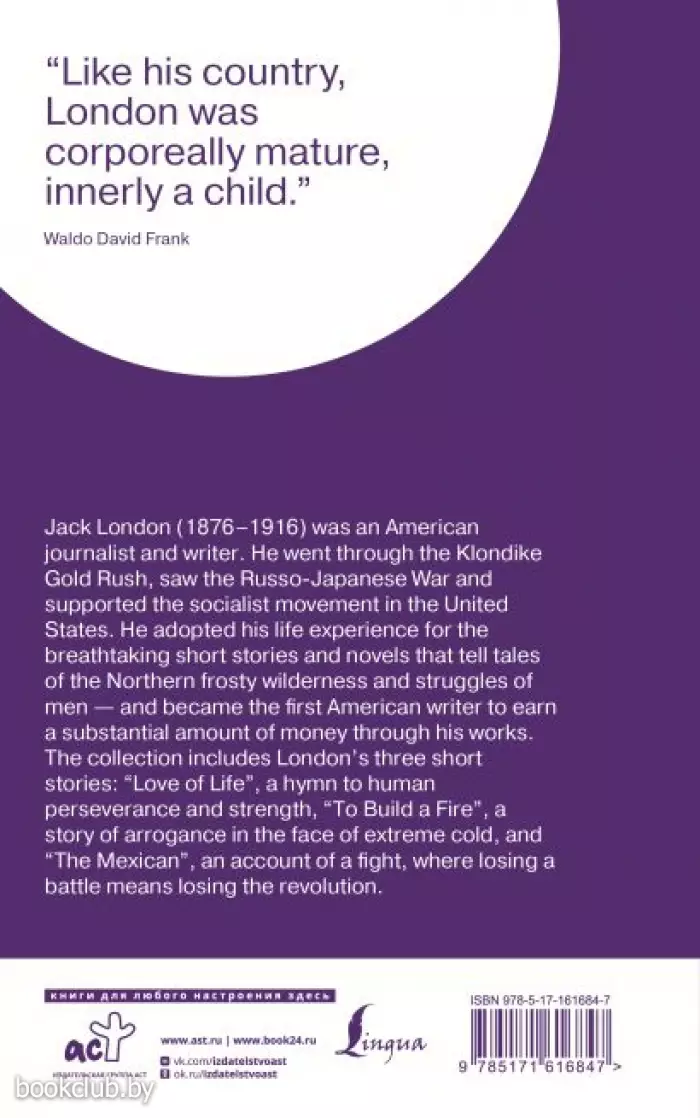 Джек Лондон (1876 -1916) — американский журналист и писатель. Лондон прошел сквозь жернова золотой лихорадки, обозревал русско-японскую войну и участвовал в деятельности социалистического движения в Соединенных Штатах. Свой жизненный опыт он использовал для написания захватывающих рассказов и романов о человеческих исканиях и жестокости северной пустоши — и стал первым писателем в Америке, который смог хорошо заработать на своем творчестве.