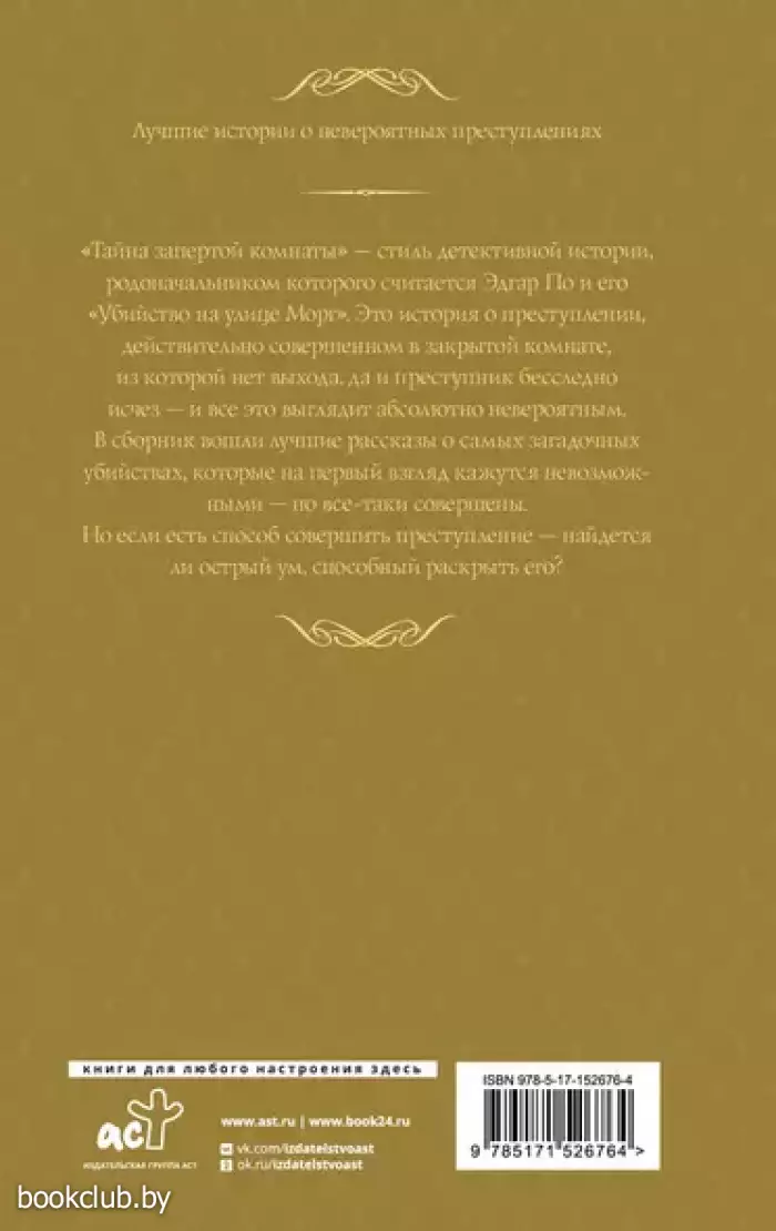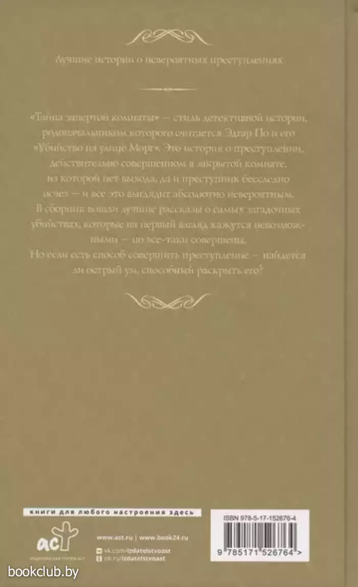 «Тайна запертой комнаты» – стиль детективной истории, родоначальником которого считается Эдгар По и его «Убийство на улице Морг». Это история о преступлении, действительно совершенном в закрытой комнате, из которой нет выхода, да и преступник бесследно исчез – и все это выглядит абсолютно невероятным. В сборник вошли лучшие рассказы о самых загадочных убийствах, которые, на первый взгляд, кажутся невозможными – но все-таки совершены. Но если есть способ совершить преступление – найдется ли острый ум, способный раскрыть его?
