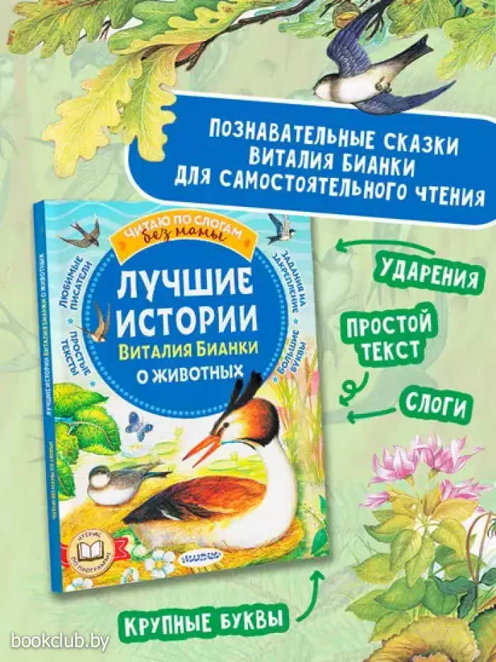 В книгу вошли познавательные сказки Виталия Бианки. Юный читатель познакомится с удивительным миром животных, узнает много интересных фактов и научится беречь природу. Красочные иллюстрации помогут полностью погрузиться в чтение. А крупные буквы и ударения позволят малышам самостоятельно познакомиться с увлекательными историями.