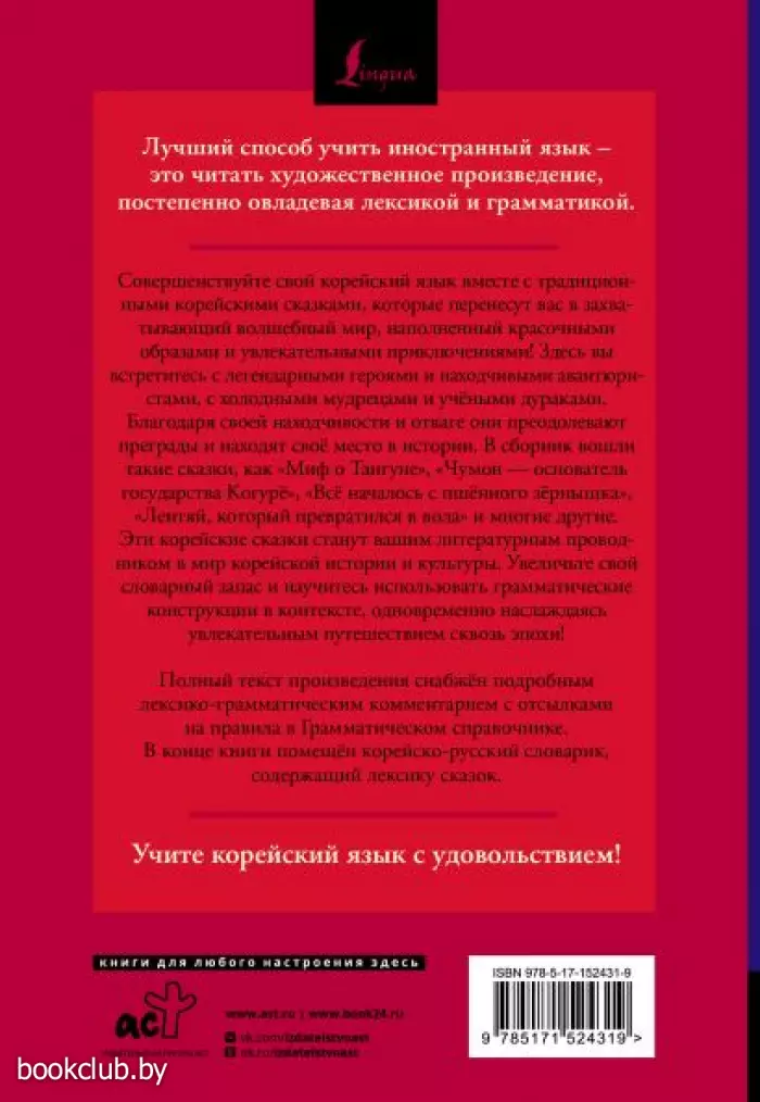 Совершенствуйте свой корейский язык вместе с традиционными корейскими сказками, которые перенесут вас в захватывающий волшебный мир, наполненный красочными образами и увлекательными приключениями! Здесь вы встретитесь с легендарными героями и находчивыми авантюристами, с холодными мудрецами и учёными дураками. Благодаря своей находчивости и отваге они преодолевают преграды и находят своё место в истории. В сборник вошли такие сказки, как "Миф о Тангуне", "Чумон — основатель государства Когурё", "Всё началось с пшённого зёрнышка", "Лентяй, который превратился в вола" и многие другие. Эти корейские сказки станут вашим литературным проводником в мир корейской истории и культуры. Увеличьте свой словарный запас и научитесь использовать грамматические конструкции в контексте, одновременно наслаждаясь увлекательным путешествием сквозь эпохи!