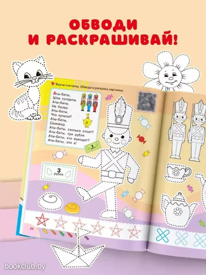 В книге вы найдете рисунки для обводки и раскрашивания, иллюстрирующие сюжеты потешек, скороговорок и считалок. Слушая и повторяя короткие стихотворения, и одновременно обводя и раскрашивая картинки к ним, ребенок будет развивать два тесно связанных между собой навыка: мелкую моторику и речь. Такие занятия станут для малыша не только источником радости, но и эффективной развивающей игрой: ребенок подготовит руку к письму, обогатит словарный запас, потренирует произношение трудных звуков, разовьет память, воображение и мышление.