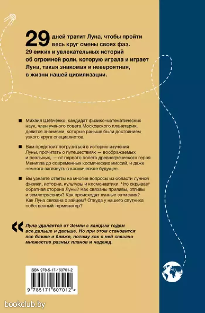 29 дней тратит Луна, чтобы пройти весь круг смены своих фаз. 29 емких и увлекательных историй об огромной роли, которую играла и играет Луна, такая знакомая и невероятная, в жизни нашей цивилизации. Михаил Шевченко делится знаниями, которые раньше были уделом узкого круга специалистов. Вам предстоит погрузиться в историю изучения Луны, прочитать о путешествиях — воображаемых и реальных, — от первого полета древнегреческого героя Мениппа до современных космических миссий и даже немного заглянуть в космическое будущее. Вы узнаете ответы на многие вопросы из области лунной физики, истории, культуры и космонавтики. Что скрывает обратная сторона Луны? Как связаны приливы, отливы и землетрясения? Как происходят лунные затмения? Как Луна связана с зайцем? Откуда у нашего спутника собственный терминатор?