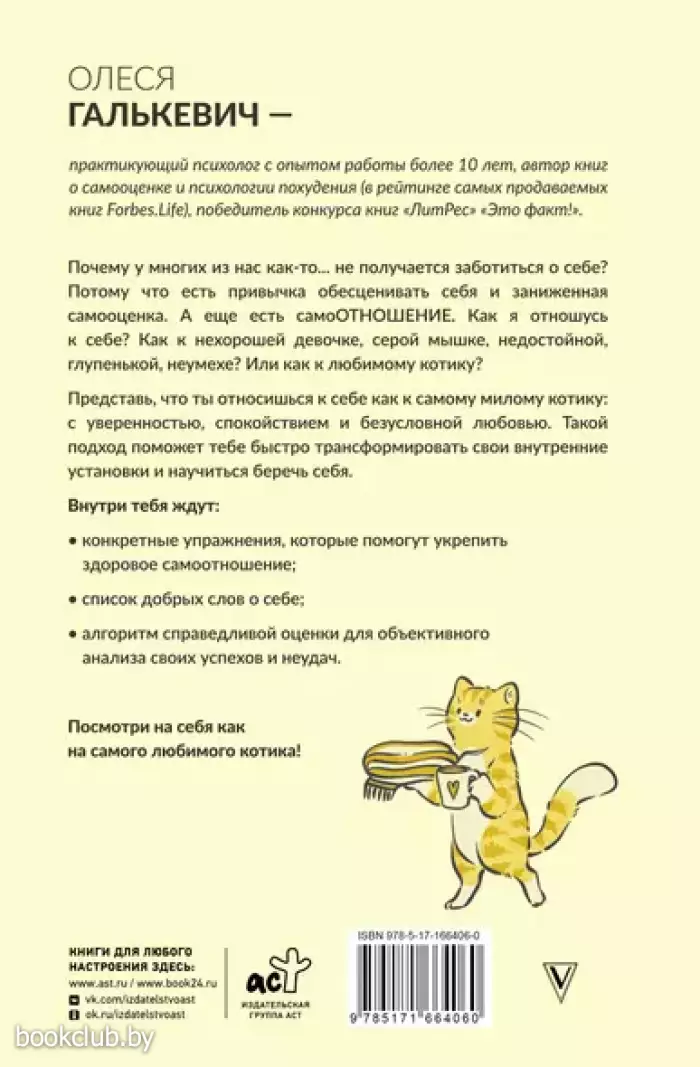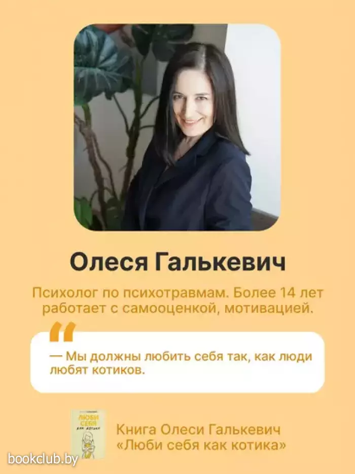 "Олеся Галькевич — практикующий психолог с опытом работы более 10 лет, автор книг о самооценке и психологии похудения (в рейтинге самых продаваемых книг Forbes.Life), победитель конкурса книг «ЛитРес» «Это факт!».