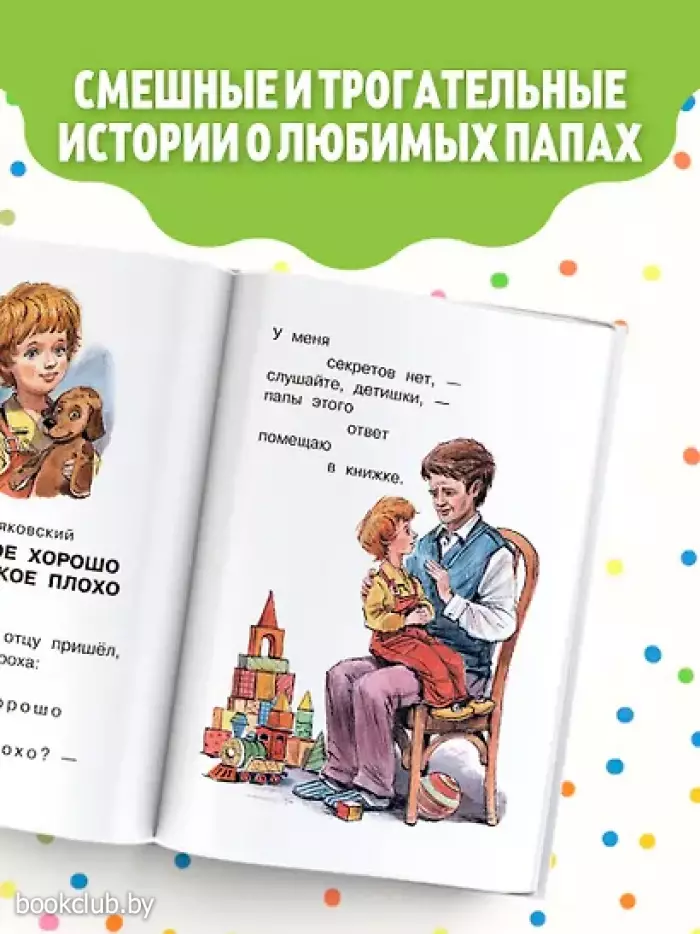 В нашем сборнике «Любимому папочке. Стихи и рассказы» мы собрали много произведений, посвящённых папам: стихотворение В. Маяковского «Что такое хорошо и что такое плохо», смешные рассказы и вредные советы Г. Остера, трогательные рассказы В. Драгунского и многие другие.