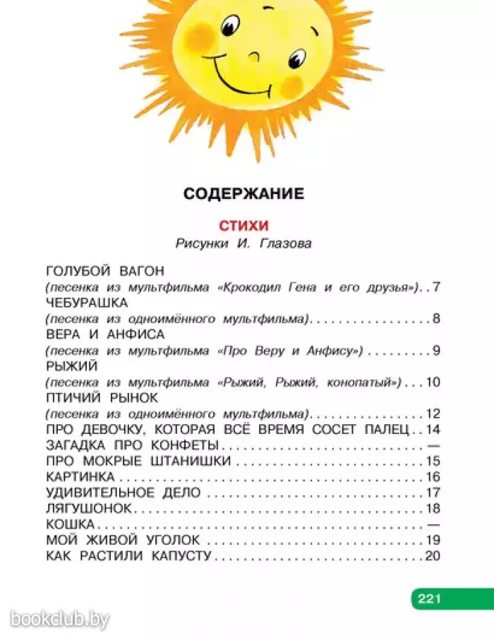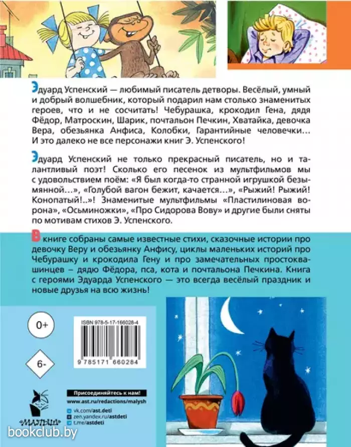 В книге собраны самые известные стихи, сказочные истории про девочку Веру и обезьянку Анфису, циклы маленьких историй про Чебурашку и крокодила Гену и про замечательных простоквашинцев – дядю Фёдора, пса, кота и почтальона Печкина. Книга с героями Эдуарда Успенского – это всегда весёлый праздник и новые друзья на всю жизнь!