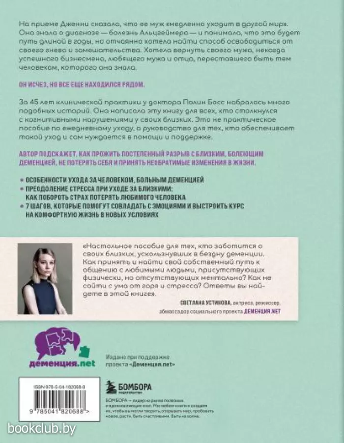Уход за тяжело болеющим человеком требует не только невероятных физических, но и моральных сил. Зачастую людей тяготит их обязанность опекунства над близкими, ведь это постепенно приводит к выгоранию. Постоянный стресс, связанный с беспокойством и волнением за дорогого человека, бессонница и постоянное чувство потери — все это может вывести из равновесия, а при затяжном состоянии ввести в депрессию. Эта книга-поддержка создана специально для таких случаев: вы узнаете, как принять потерю и побороть тревогу, какие ритуалы следует ввести в повседневную жизнь с больным деменцией и как найти время на заботу о себе.