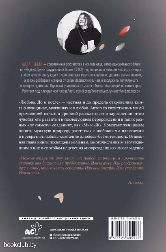Лара Галль — современная российская писательница, автор одноименного блога на "Яндекс.Дзен" с аудиторией более 14 000 подписчиков, в котором честно, с юмором и "без купюр" рассуждает о человеческих взаимоотношениях, делится своим опытом, а также разбирает истории от своих подписчиков, чем и заслужила популярность и доверие аудитории.