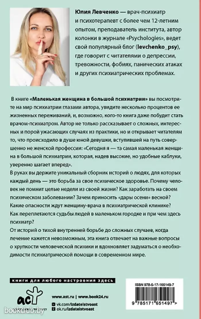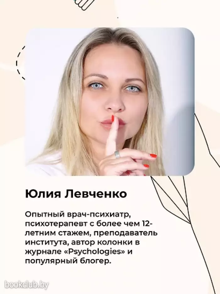 Юлия Левченко — врач-психиатр и психотерапевт с более чем 12-летним опытом, преподаватель института, автор колонки в журнале ""Psychologies"", ведет свой популярный блог (levchenko_psy), где говорит с читателями о депрессии, тревожности, фобиях, панических атаках и других психиатрических проблемах.