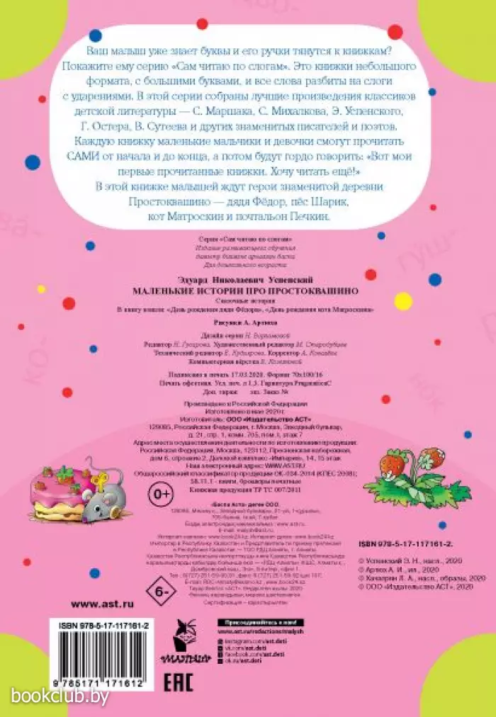 В этой книжке малышей ждут герои знаменитой деревни Простоквашино - дядя Фёдор, пёс Шарик, кот Матроскин и почтальон Печкин.