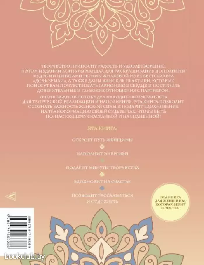 Творчество приносит радость и удовлетворение. В этом издании контуры мандал для раскрашивания дополнены мудрыми цитатами Регины Жиляевой из ее бестселлера "Дочь Земли", а также даны женские практики, которые помогут вам почувствовать гармонию в сердце и построить доверительные и глубокие отношения с партнером.