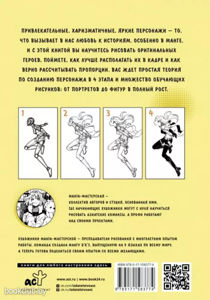 Вас ждет простая теория по созданию персонажа в 4 этапа и множество обучающих рисунков: от портретов до фигур в полный рост.