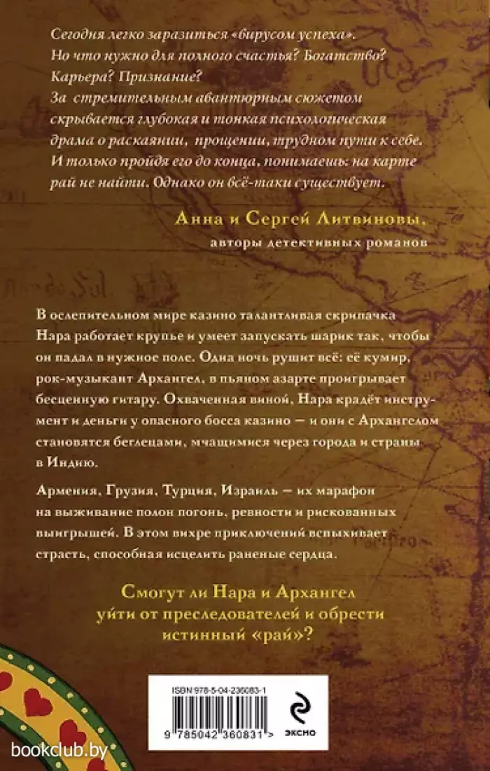 В ослепительном мире казино талантливая скрипачка Нара работает крупье и умеет запускать шарик так, чтобы он падал в нужное поле. Одна ночь рушит всё: её кумир, рок-музыкант Архангел, в пьяном азартe проигрывает бесценную гитару. Охваченная виной, Нара крадёт инструмент и деньги у опасного босса казино — и они с Архангелом становятся беглецами, мчащимися через города и страны в Индию.Армения, Грузия, Израиль, Турция — их марафон на выживание полон погонь, ревности и рискованных выигрышей. В этом вихре приключений вспыхивает страсть, способная исцелить раненые сердца.Смогут ли Нара и Архангел уйти от преследователей и обрести истинный "рай"? Книга от издательства «ЭКСМО», входящая в серию «Почти счастливые люди», принесет массу положительных впечатлений от прочтения и займет достойное место в вашей библиотеке. Для вашего удобства при оформлении заказа по телефону назовите код товара: 417003