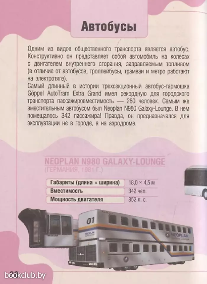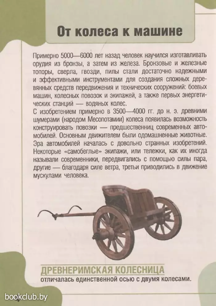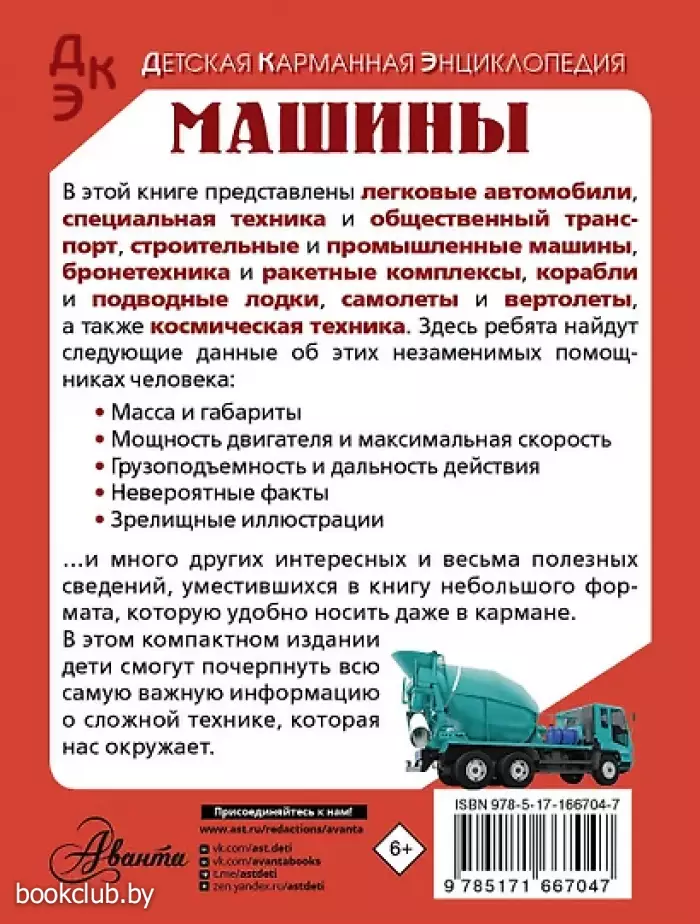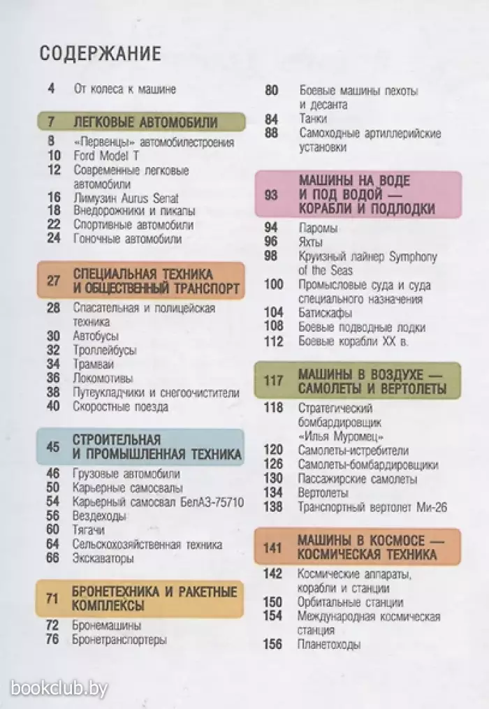 На страницах этой книги юные читатели найдут справочную информацию о машинах, работающих не только на нашей планете — на земле, воде и ввоздухе,— но и в далеком космическом пространстве. А самое главное — здесь содержатся интересные и порой поражающие воображение факты о специальной технике и общественном транспорте, легковых автомобилях, строительных машинах, бронетехнике и ракетных комплексах, кораблях и подводных лодках, самолетах ивертолетах, а также о космической технике. Множество высокотехнологичных машин, их основные отличительные черты, масса и габариты, мощность двигателя и максимальная скорость, уникальные особенности, а также познавательные сведения о достижениях человечества внаучно-технической сфере и в области машиностроения — в одном издании компактного формата. Каждый образец техники представлен на красочных иллюстрациях, чтосделает знакомство с миром машин еще более увлекательным!