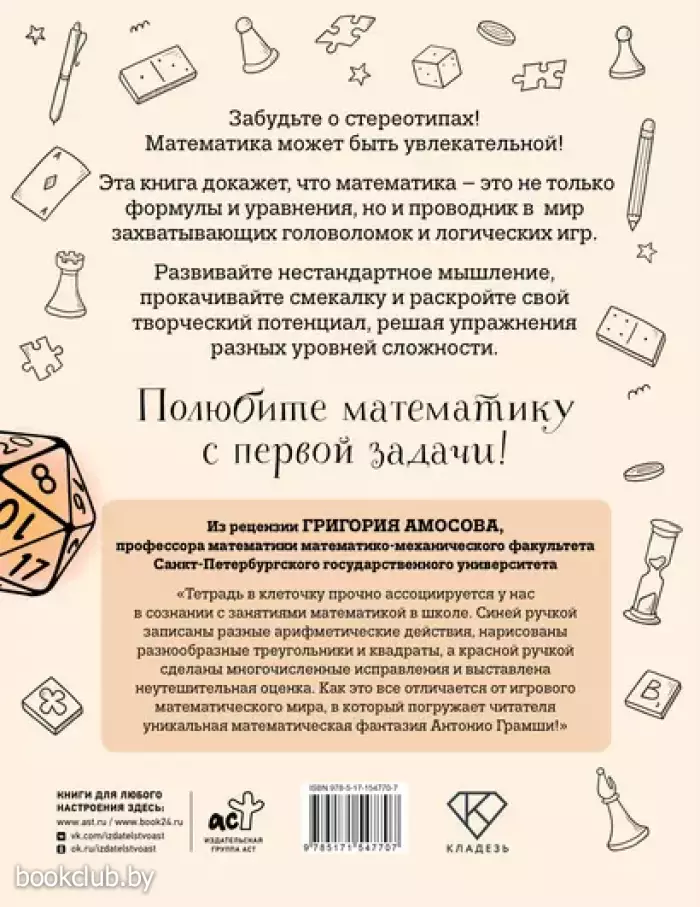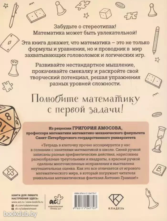 Забудьте о стереотипах! Математика может быть увлекательной! Эта книга докажет, что математика — это не только формулы и уравнения, но и проводник в мир захватывающих головоломок и логических игр. Развивайте нестандартное мышление, прокачивайте смекалку и раскройте свой творческий потенциал, решая упражнения разных уровней сложности. Полюбите математику с первой задачи!