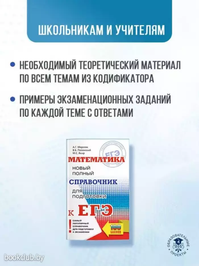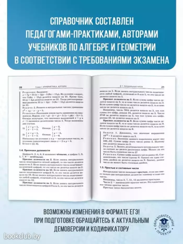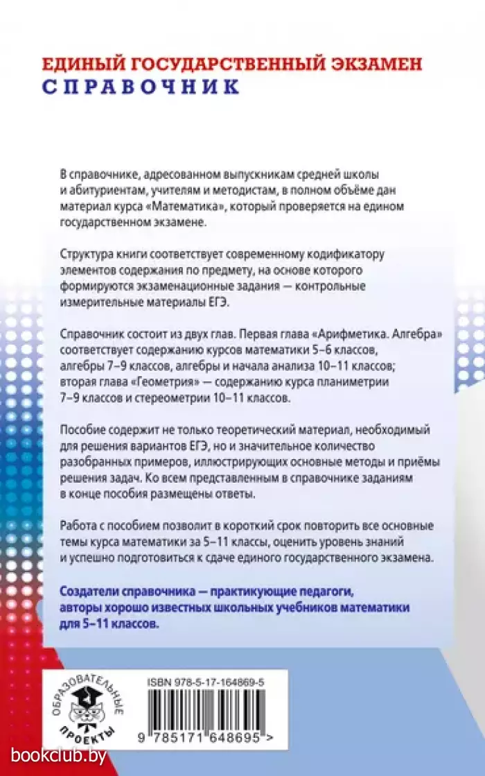 Справочник содержит материал курса "Математика" в объёме, проверяемом на едином государственном экзамене. Структура книги соответствует современному кодификатору элементов содержания по предмету, на основе которого формируются экзаменационные задания — контрольные измерительные материалы ЕГЭ. Справочник состоит из двух глав: "Арифметика. Алгебра" и "Геометрия". Помимо теоретического материала в справочнике представлено значительное количество разобранных примеров, иллюстрирующих основные методы и приёмы решения задач. Ко всем заданиям в конце пособия даны ответы для самопроверки. Работа с пособием позволит повторить все основные темы курса математики за 5–11 классы и успешно подготовиться к сдаче ЕГЭ.