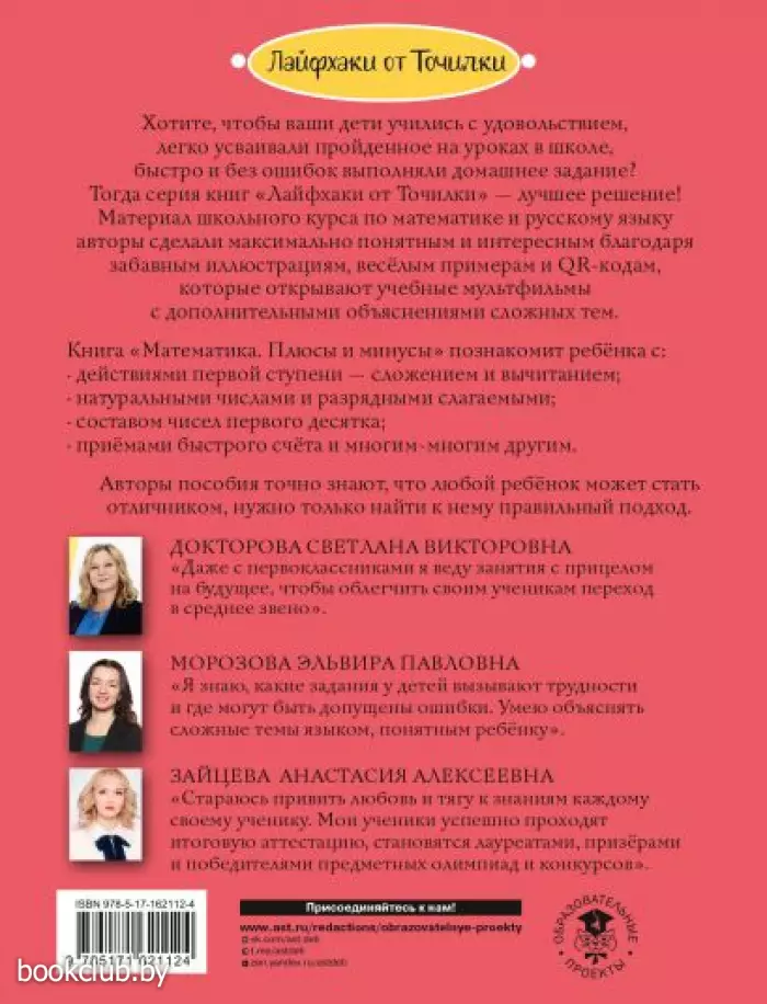 Хотите, чтобы ваши дети учились с удовольствием, легко усваивали пройденное на уроках в школе, быстро и без ошибок выполняли домашнее задание? Тогда серия книг "Лайфхаки от Точилки" — лучшее решение! Материал школьного курса по математике и русскому языку авторы сделали максимально понятным и интересным благодаря забавным иллюстрациям, весёлым примерам и QR-кодам, которые открывают учебные мультфильмы с дополнительными объяснениями сложных тем.