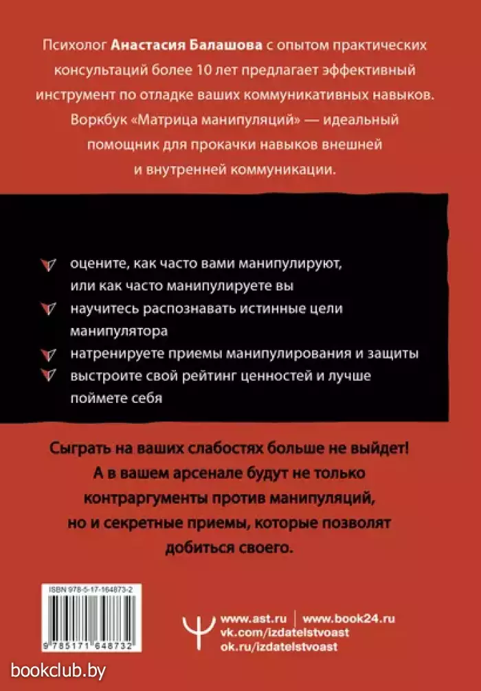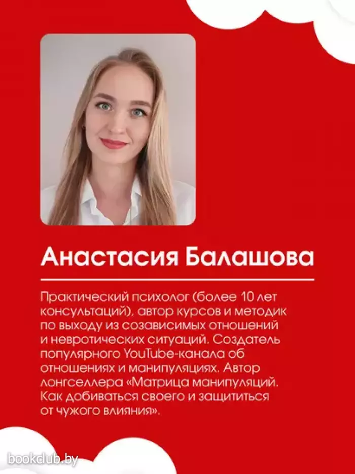 Психолог Анастасия Балашова с опытом практических консультаций более 10 лет, автор книги «Матрица манипуляций», предлагает воркбук, который поможет вам отточить способность распознавать манипуляции, оценивать степень причиняемого ими ущерба, а также научит применять манипулятивные техники. Кроме того, воркбук — отличный инструмент самопознания. Самостоятельная работа с книгой — путь к пониманию ваших ценностей, эмоций, сильных и слабых сторон. Возьмите свою жизнь под контроль и направляйте себя в сторону счастья.