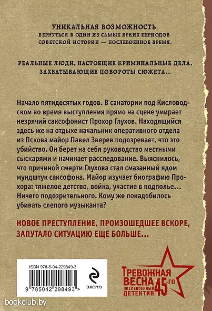 Начало пятидесятых годов. В санатории под Кисловодском во время выступления прямо на сцене умирает незрячий саксофонист Прохор Глухов. Находящийся здесь же на отдыхе начальник оперативного отдела из Пскова майор Павел Зверев подозревает, что это убийство. Он берет на себя руководство местными сыскарями и начинает расследование. Выяснилось, что причиной смерти Глухова стал смазанный ядом мундштук саксофона. Майор изучает биографию Прохора: тяжелое детство, война, участие в подполье… Ничего подозрительного. Кому же понадобилось убивать слепого музыканта? Новое преступление, произошедшее вскоре, запутало ситуацию еще больше…