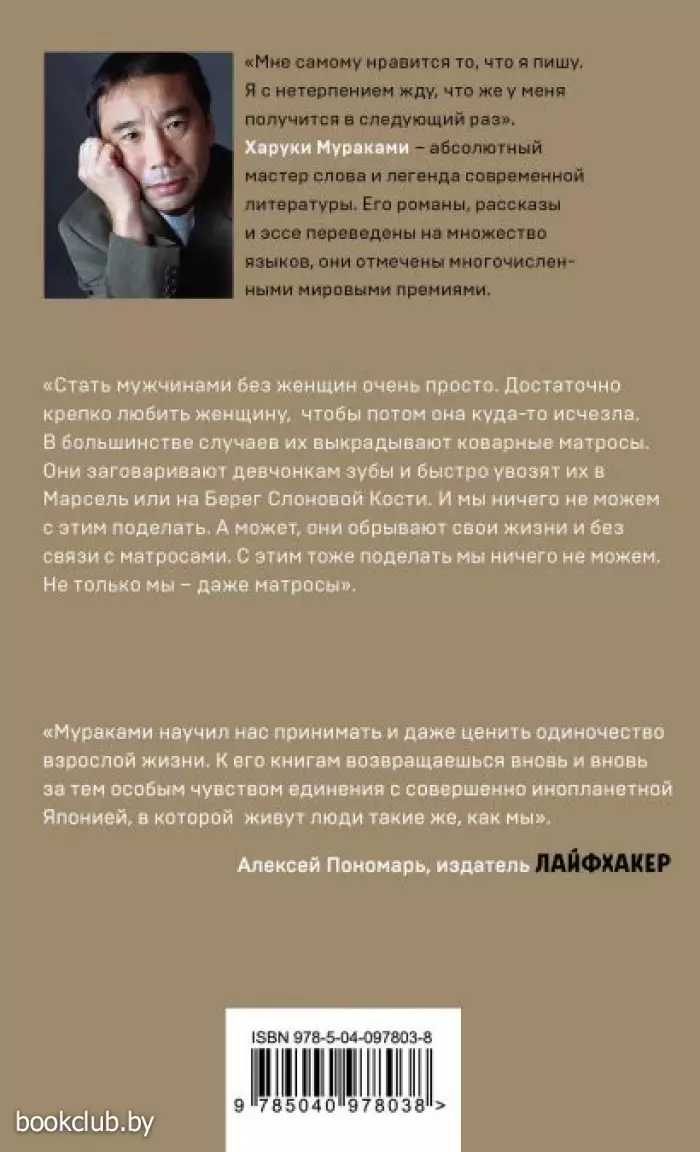 О книге: «Мужчины без женщин» — сборник новелл и эссе о людях разного возраста, социального положения, статуса, но объединенных одним общим мотивом: все они о мужчинах, оставшихся без женщин. Кого-то из них разлучила измена возлюбленной, кого-то — смерть любимой, кто-то остался один волею случая, а для кого-то это осознанный выбор. Легендарный мастер слова раскрывает непростые отношения между мужчинами и женщинами, которые тысячелетиями волнуют умы ученых, философов и писателей. Читателя, как всегда, ждет откровенный разговор о любви, о семье, о взаимоотношениях полов и об одиночестве.