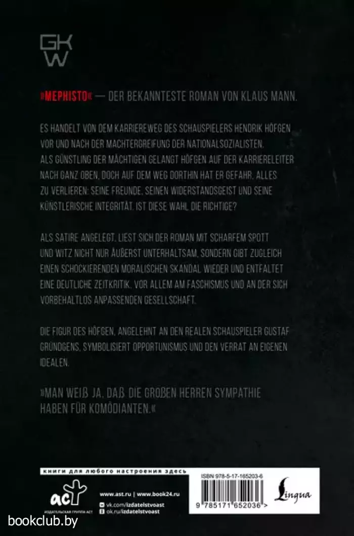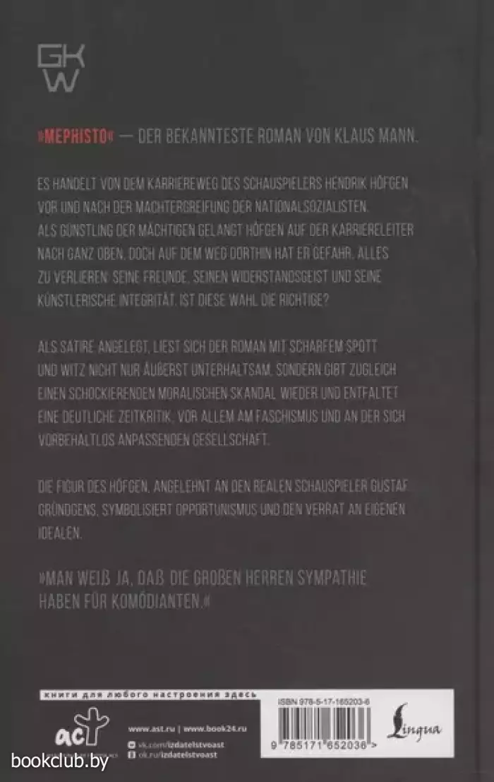 Издание на немецком языке. Роман немецкого писателя Клауса Манна «Мефистофель: История одной карьеры», опубликованный в 1936 году, – это не просто история о взаимоотношениях диктаторской власти и творческой личности. Это суровое и мощное предупреждение о том, что общественные и личные компромиссы неизбежно приводят творческого человека к потере самого себя. Действие романа происходит в мрачной и опасной обстановке Германии 1930-х годов, где талантливый актер столичного театра Хендрик Хефген предает своих близких и свои идеалы, идет на сотрудничество с нацистами ради выживания, высокого положения в театральном мире и денег. Главный герой, прототипом которого является актер Густав Грюндгенс, становится символом конформизма и нравственного падения. Манн мастерски изображает внутреннюю борьбу Хефгена, его страхи и амбиции, показывая, как легко человек может поддаться тьме, променяв свою душу на успех и материальные блага. По роману Клауса Манна в 1981 году был снят фильм «Мефисто», удостоенный премии «Оскар».
