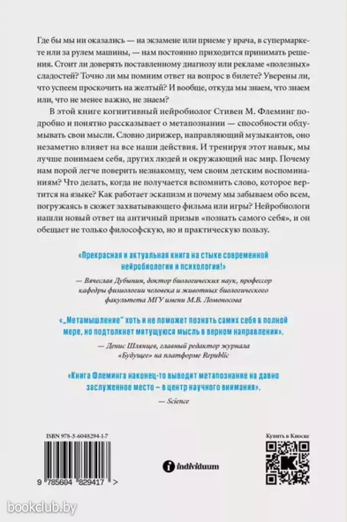 Где бы мы ни оказались — на экзамене или приеме у врача, в супермаркете или за рулем машины, — нам постоянно приходится принимать решения. Стоит ли доверять поставленному диагнозу или рекламе «полезных» сладостей? Точно ли мы помним ответ на вопрос в билете? Уверены ли, что успеем проскочить на желтый? И вообще, откуда мы знаем, что знаем или, что не менее важно, не знаем? В этой книге когнитивный нейробиолог Стивен М. Флеминг подробно и понятно рассказывает о метапознании — способности обдумывать свои мысли. Словно дирижер, направляющий музыкантов, оно незаметно влияет на все наши действия. И тренируя этот навык, мы лучше понимаем себя, других людей и окружающий нас мир. Почему нам порой легче поверить незнакомцу, чем своим детским воспоминаниям? Что делать, когда не получается вспомнить слово, которое вертится на языке? Как работает эскапизм и почему мы забываем обо всем, погружаясь в сюжет захватывающего фильма или игры? Нейробиологи нашли новый ответ на античный призыв «познать самого себя», и он обещает не только философскую, но и практическую пользу.