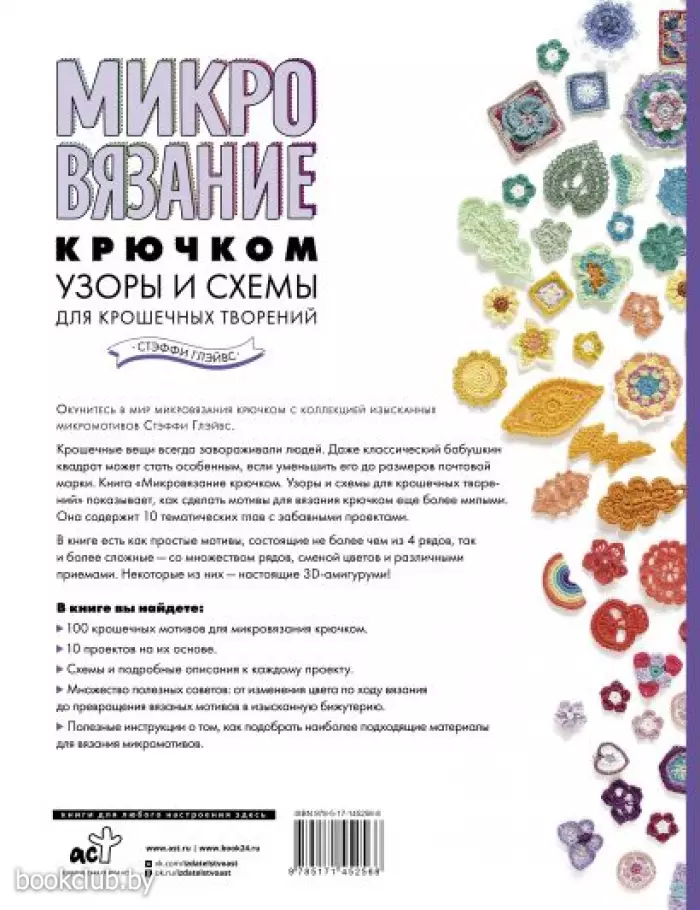 В книге"Микровязание крючком. Узоры и схемы для крошечных творений" вы найдете 100 схем с подробными описаниями: цветы, листья, растения, еда, животные, 3D амигуруми, бабушкины квадраты, мандалы и многое другое, а также готовые проекты по сочетанию мотивов.