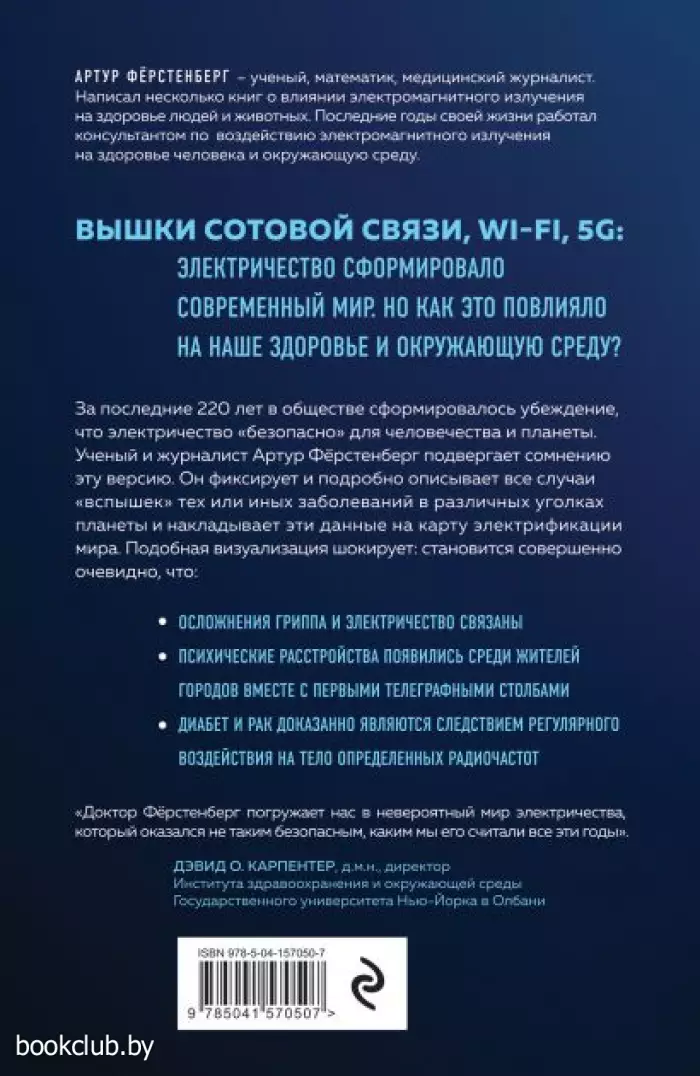 Пчелы погибают при жизни под высоковольтными линиями электропередач. Вспышки гриппа и других вирусных инфекций совпали с электрификацией данных районов. Рак, деменция и неврологические болезни возникли одновременно с электромагнитным загрязнением планеты. Возможно, все это совпадение. А может быть, и нет. Книга ученого Артура Ферстенберга рассказывает о том, что мы знаем на сегодня о влиянии электромагнитного излучения на здоровье сердца и сосудов, мозга и всей нервной системы, эндокринных органов и либидо. Вы удивитесь, узнав, как много исследований сегодня посвящено влиянию ЭМП на здоровье и каковы их первые трагические данные.