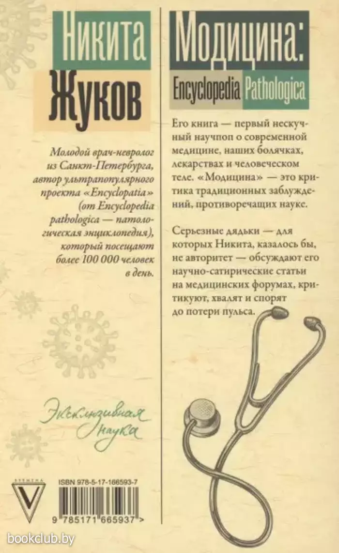 Никита Жуков – молодой врач-невролог из Санкт-Петербурга, автор ультрапопулярного проекта «Encyclopatia» (от Encyclopedia pathologica — патологическая энциклопедия), который посещают более 100 000 человек в день. Его книга — первый нескучный научпоп о современной медицине, о наших болячках, лекарствах и человеческом теле. «Модицина» — это критика традиционных заблуждений, противоречащих науке. Серьезные дядьки — для которых Никита, казалось бы, не авторитет — обсуждают его научно-сатирические статьи на медицинских форумах, критикуют, хвалят и спорят до потери пульса.