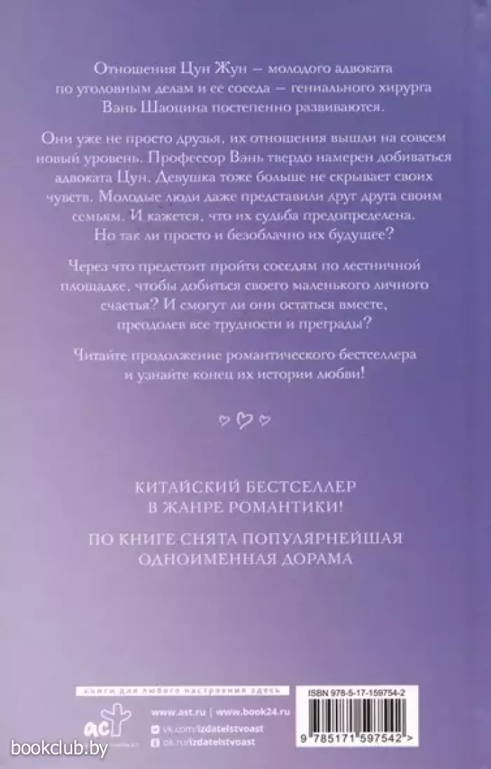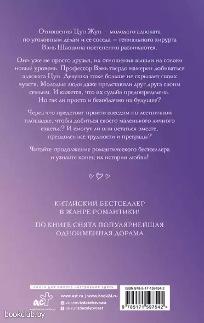 Отношения Цун Жун — молодого адвоката по уголовным делам и ее соседа — гениального хирурга Вэнь Шаоцина постепенно развиваются. Они уже не просто друзья, их отношения вышли на совсем новый уровень. Профессор Вэнь твердо намерен добиваться адвоката Цун. Девушка тоже больше не скрывает своих чувств. Молодые люди даже представили друг друга своим семьям. И кажется, что их судьба предопределена. Но так ли просто и безоблачно их будущее? Через что предстоит пройти соседям по лестничной площадке, чтобы добиться своего маленького личного счастья? И смогут ли они остаться вместе, преодолев все трудности и преграды? Читайте продолжение романтического бестселлера и узнайте конец их истории любви!