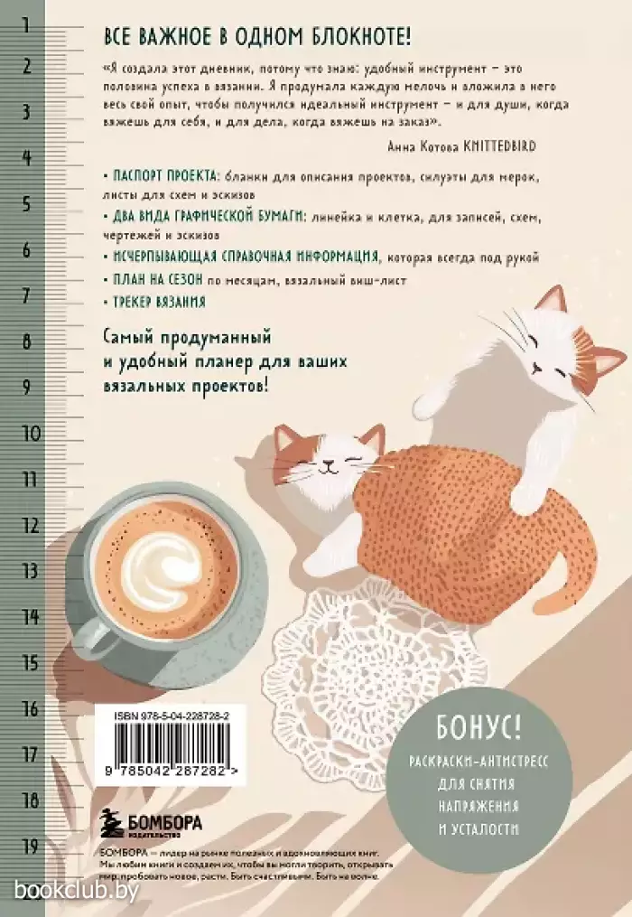 Идеальный планер для тех кто вяжет для себя и на заказ! Все в одном месте: страницы для описания проектов, схемы для расчетов петель, таблицы для снятия мерок, график работы, трекер и даже раскраски антистресс. Забудьте о клочках бумаги и никогда не теряйте ход мысли.