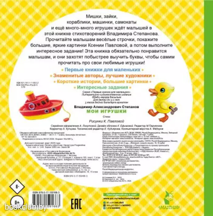 Мишки, зайки, кораблики, машинки, самокаты и ещё много-много игрушек ждёт малышей в этой книжке стихотворений Владимира Степанова. Прочитайте малышам весёлые строчки, покажите большие, яркие картинки Ксении Павловой, а потом выполните интересное задание! Эта книжка обязательно понравится малышам, и они захотят побыстрее выучить буквы, чтобы самим прочитать про свои любимые игрушки! Книги издательства «АСТ» из серии «Первые книжки для маленьких» - правильный выбор и отличное приобретение. Для вашего удобства при оформлении заказа по телефону назовите код товара: 401755
