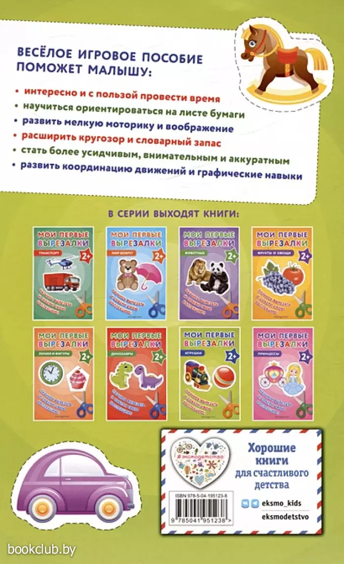 Увлекательная красочная книга-вырезалка для малышей поможет расширить кругозор ребенка, развить мелкую моторику, внимание, воображение, речь, увеличить словарный запас. Начинать заниматься можно с 2-х лет, постепенно приучая малыша правильно держать ножницы и ориентироваться на листе.