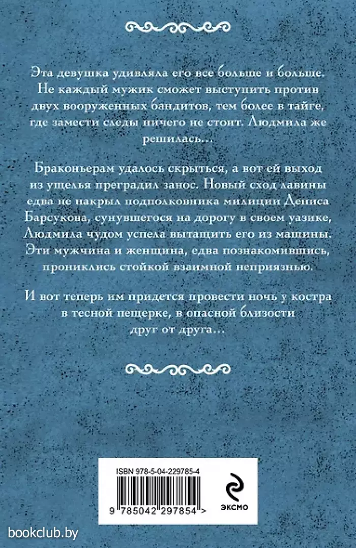 Эта девушка удивляла его все больше и больше. Не каждый мужик сможет выступить против двух вооруженных бандитов, тем более в тайге, где замести следы ничего не стоит. Людмила же решилась… Браконьерам удалось скрыться, а вот ей выход из ущелья преградил занос. Новый сход лавины едва не накрыл подполковника милиции Дениса Барсукова, сунувшегося на дорогу в своем «уазике», Людмила чудом успела вытащить его из машины. Эти мужчина и женщина, едва познакомившись, прониклись стойкой взаимной неприязнью. И вот теперь им придется провести ночь у костра в тесной пещерке, в опасной близости друг от друга…