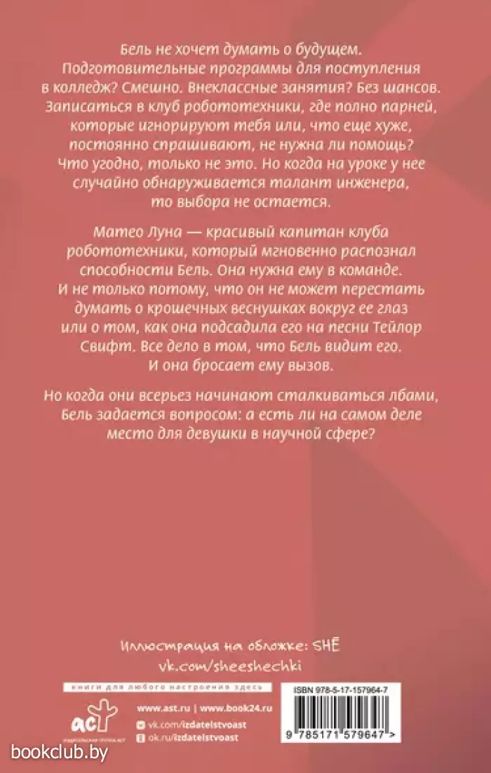 Бель не хочет думать о будущем. Подготовительные программы для поступления в колледж? Смешно. Внеклассные занятия? Без шансов. Записаться в клуб робототехники, где полно парней, которые игнорируют тебя или, что еще хуже, постоянно спрашивают, не нужна ли помощь? Что угодно, только не это. Но когда на уроке у нее случайно обнаруживается талант инженера, то выбора не остается. Матео Луна — красивый капитан клуба робототехники, который мгновенно распознал способности Бель. Она нужна ему в команде. И не только потому, что он не может перестать думать о крошечных веснушках вокруг ее глаз или о том, как она подсадила его на песни Тейлор Свифт. Все дело в том, что Бель видит его. И она бросает ему вызов. Но когда они всерьез начинают сталкиваться лбами, Бель задается вопросом: а есть ли на самом деле место для девушки в научной сфере?