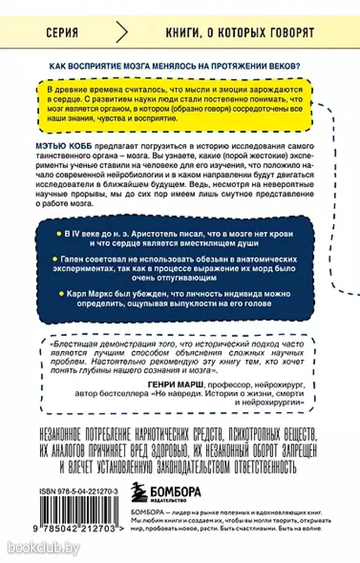 «Труд известного популяризатора науки Мэтью Кобба читается на одном дыхании. Он описывает все этапы изучения мозга с древних времен, а также неудачные попытки найти место, где спрятано наше сознание. Перед нами предстанут великие ученые и их открытия, а в завершение автор раскроет возможные пути развития мозга и новых технологий». — МИХАИЛ ТАРДОВ, д. м. н., невролог, ведущий сотрудник ГБУЗ НИКИО им. Л.И. Свержевского ДЗМ