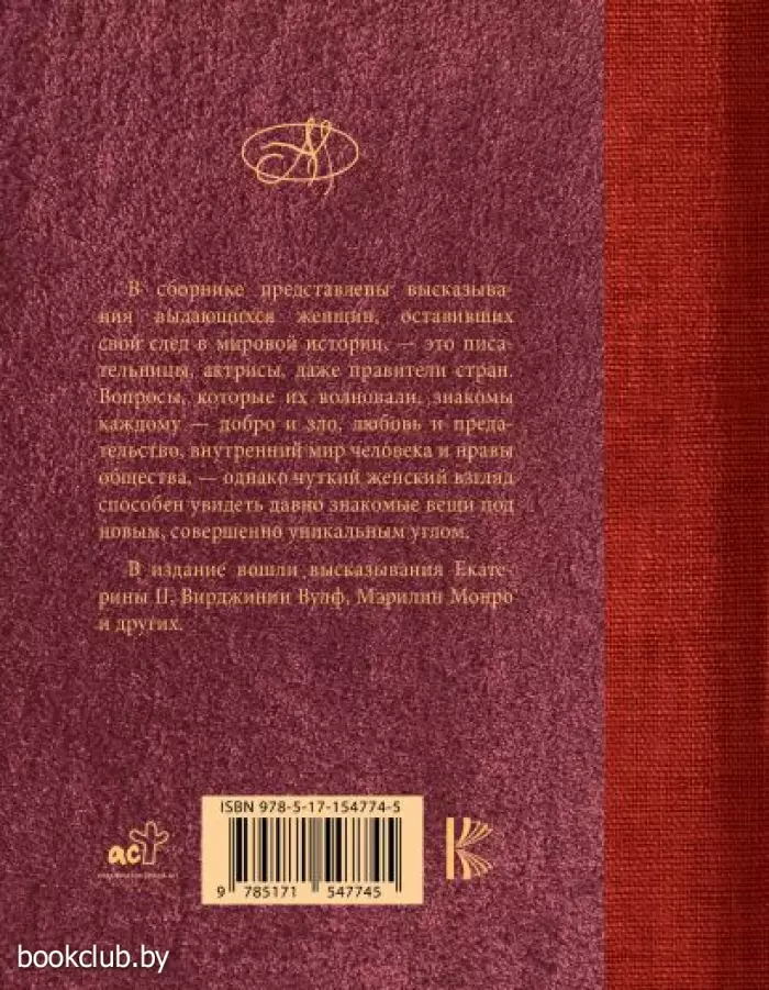 В сборнике представлены высказывания выдающихся женщин, оставивших свой след в мировой истории - это писательницы, актрисы, даже правители стран. Вопросы, которые их волнуют, знакомы каждому - добро и зло, любовь и предательство, внутренний мир человека и нравы общества, - однако чуткий женский взгляд способен увидеть давно знакомые вещи под новым, совершенно уникальным углом.