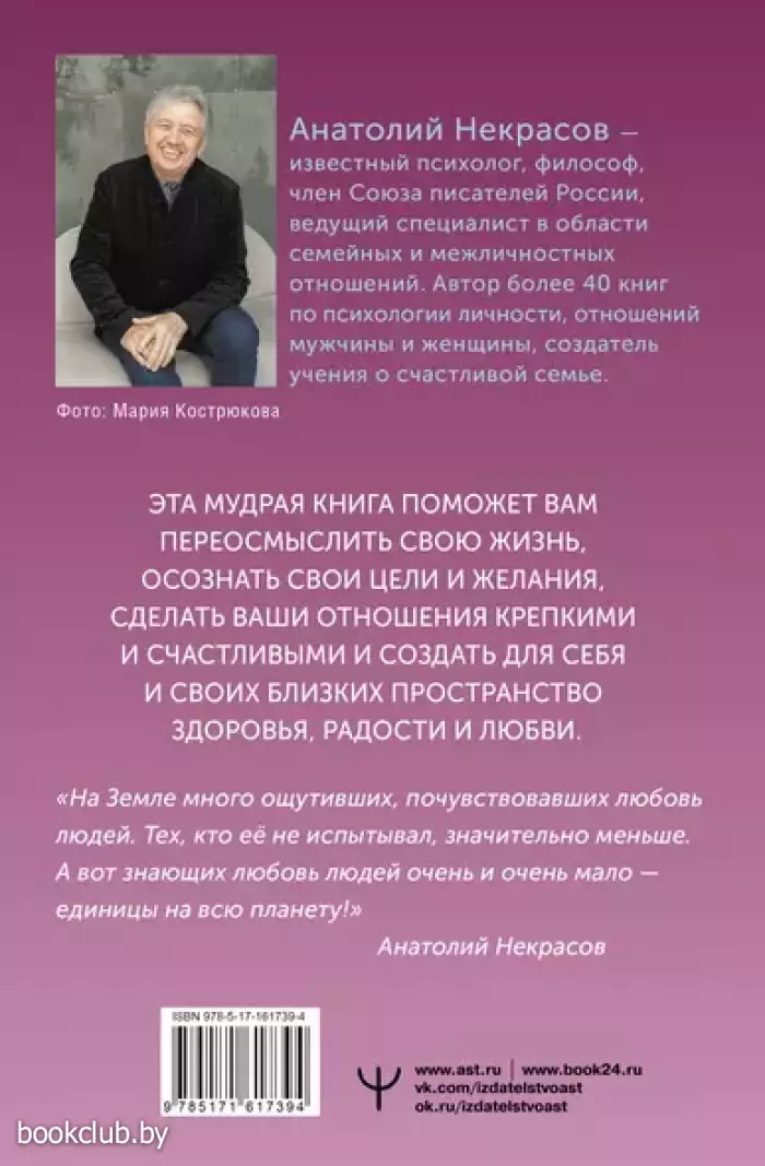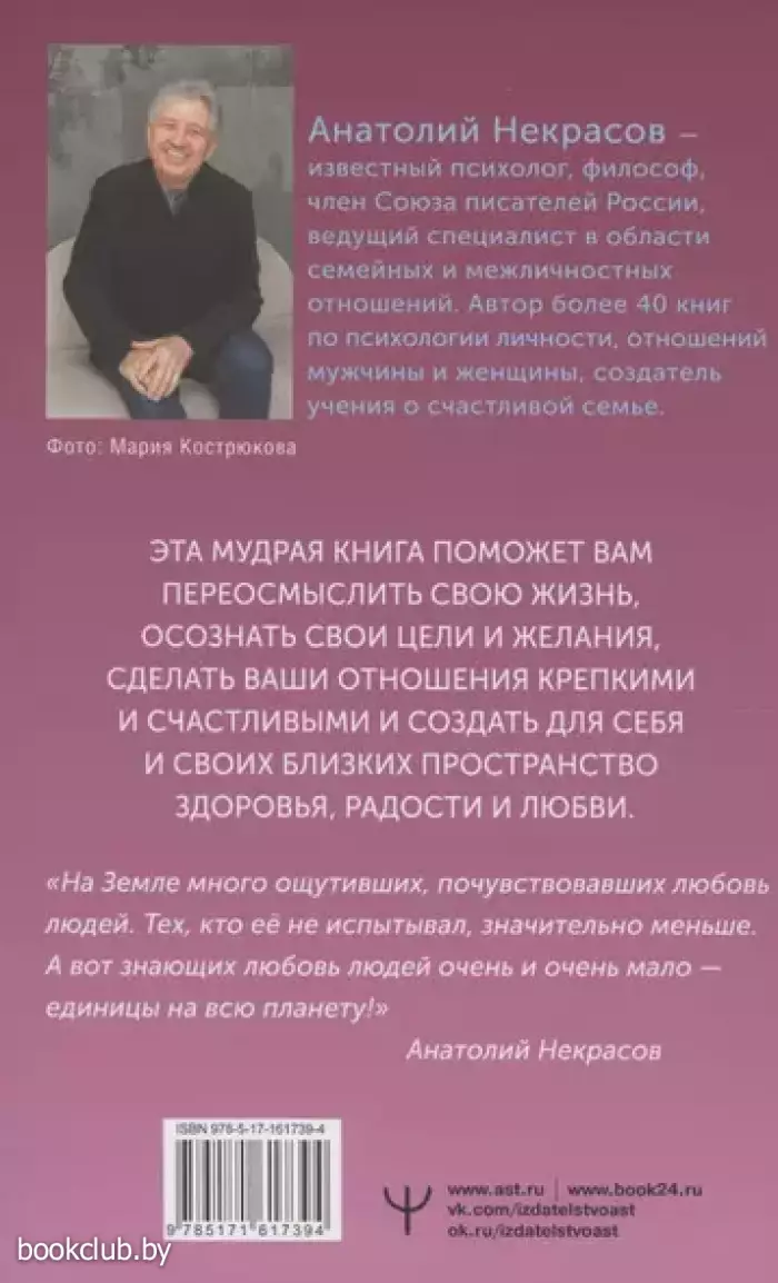 Анатолий Некрасов — известный исследователь, психолог, философ, член Союза писателей России, академик Европейской академии естественных наук, ведущий специалист в области семейных и межличностных отношений. Автор более 40 книг по психологии личности, отношений мужчины и женщины, создатель учения о счастливой семье. Эта мудрая книга его авторства поможет вам переосмыслить свою жизнь, осознать свои цели и желания, сделать ваши отношения крепкими и счастливыми и создать для себя и своих близких пространство здоровья, радости и любви. Мужчина и женщина. Что следует за этими словами? Прислушайтесь. Хочется сказать — любовь. Не правда ли? В основе всего в этом мире лежит взаимодействие этих двух творящих энергий. Всё прекрасное, доброе, радостное рождается в любви пары, точно так же, как и беды, войны и любые человеческие трагедии — тоже из-за любви, вернее, её отсутствия или искажения. Шерше ля фам… Ищите женщину, когда хотите понять причины событий, происходящих в мире и в вашей жизни. Эта мудрая книга поможет вам понять, что такое настоящая женственность и мужественность, и как с их помощью можно создать пару — мужчину и женщину, которым принадлежат все богатства Вселенной.