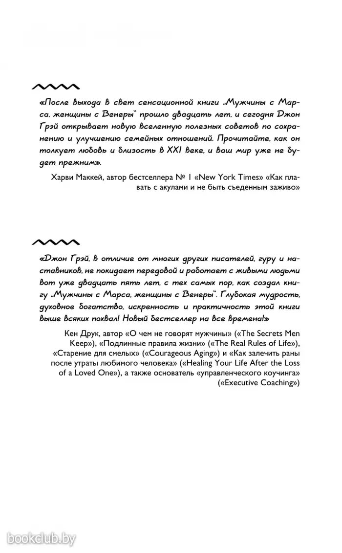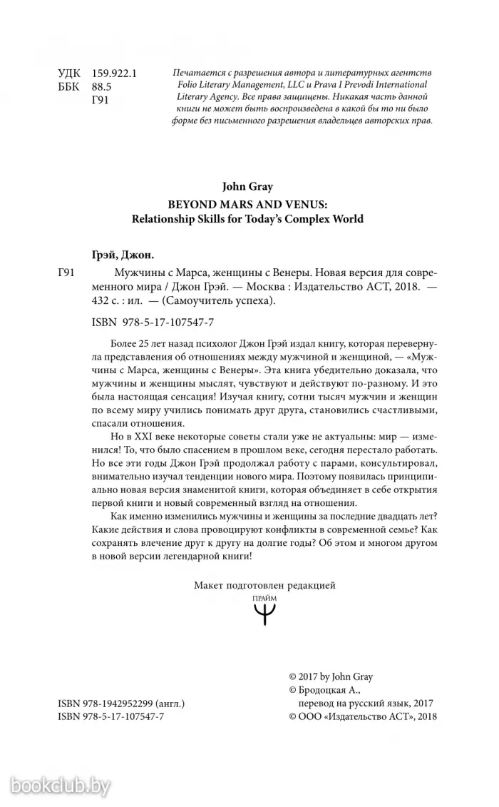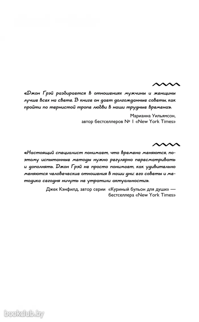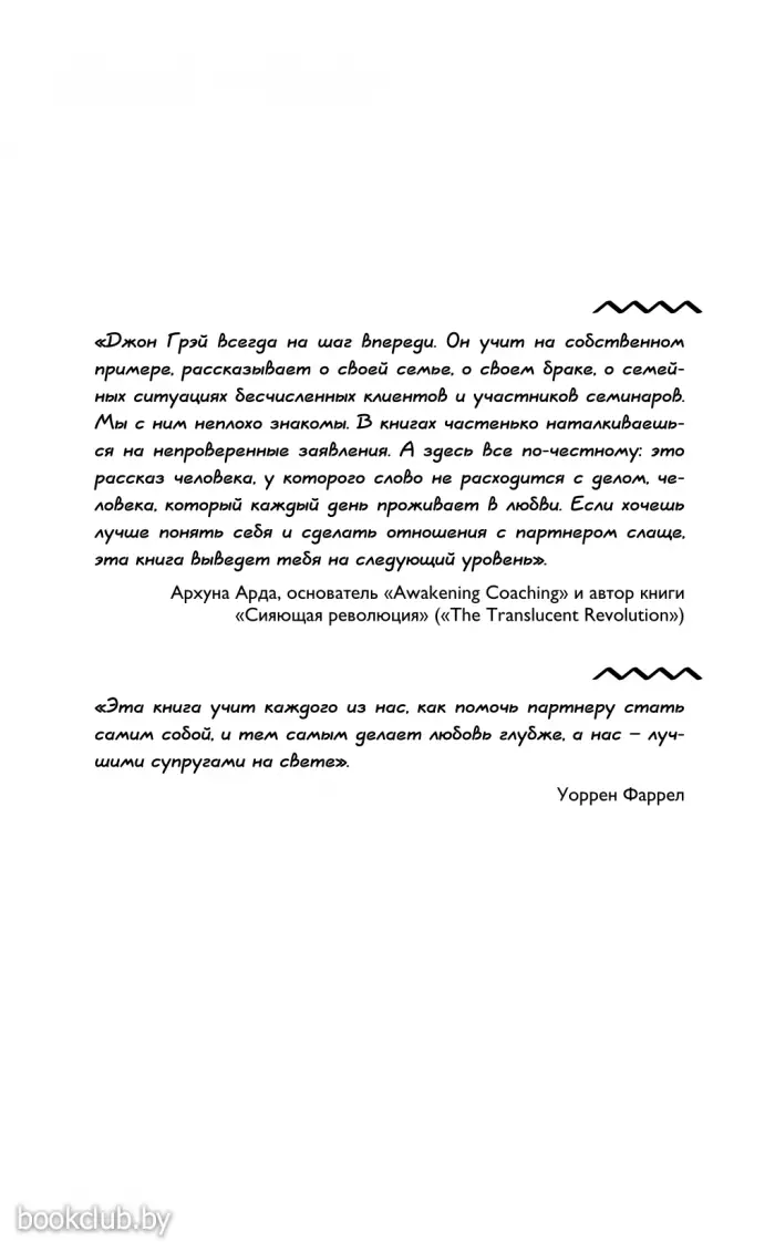 Книга от издательства «АСТ», входящая в серию «Самоучитель успеха», принесет массу положительных впечатлений от прочтения и займет достойное место в вашей библиотеке. Для вашего удобства при оформлении заказа по телефону назовите код товара: 112355 Но в XXI веке некоторые советы стали уже не актуальны: мир изменился! То, что было спасением в прошлом веке, сегодня перестало работать. Но все эти годы Джон Грэй продолжал работу с парами, консультировал, внимательно изучал тенденции нового мира. Поэтому появилась принципиально новая версия знаменитой книги, которая объединяет в себе открытия первой книги и новый современный взгляд на отношения.