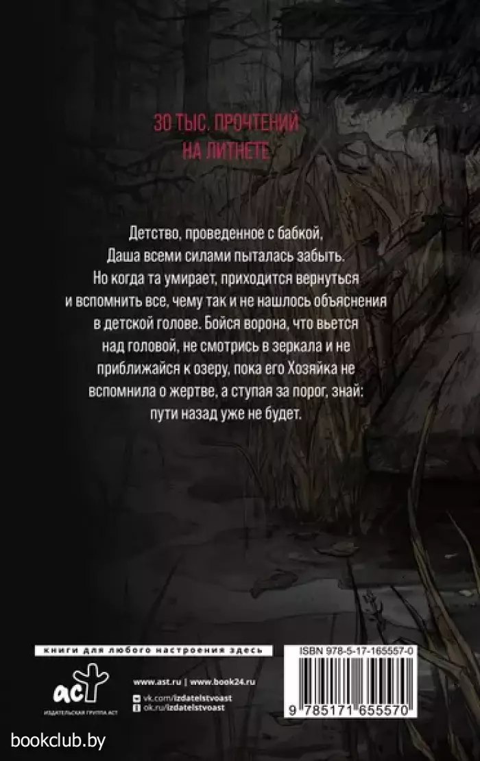 Детство, проведенное с бабкой, Даша всеми силами пыталась забыть. Но когда та умирает, приходится вернуться и вспомнить все, чему так и не нашлось объяснения в детской голове. Бойся ворона, что вьется над головой, не смотрись в зеркала и не приближайся к озеру, пока его Хозяйка не вспомнила о жертве, а ступая за порог, знай: пути назад уже не будет.