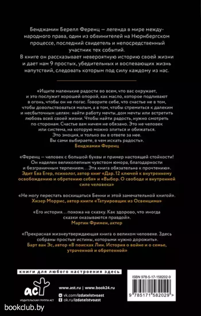 Бенджамин Берелл Ференц — легенда в мире международного права, один из обвинителей на Нюренбергском процессе, последний свидетель и непосредственный участник тех событий. В книге он рассказывает невероятную историю своей жизни, и дает нам 9 простых, убедительных и воспевающих жизнь напутствий, следовать которым под силу каждому из нас.