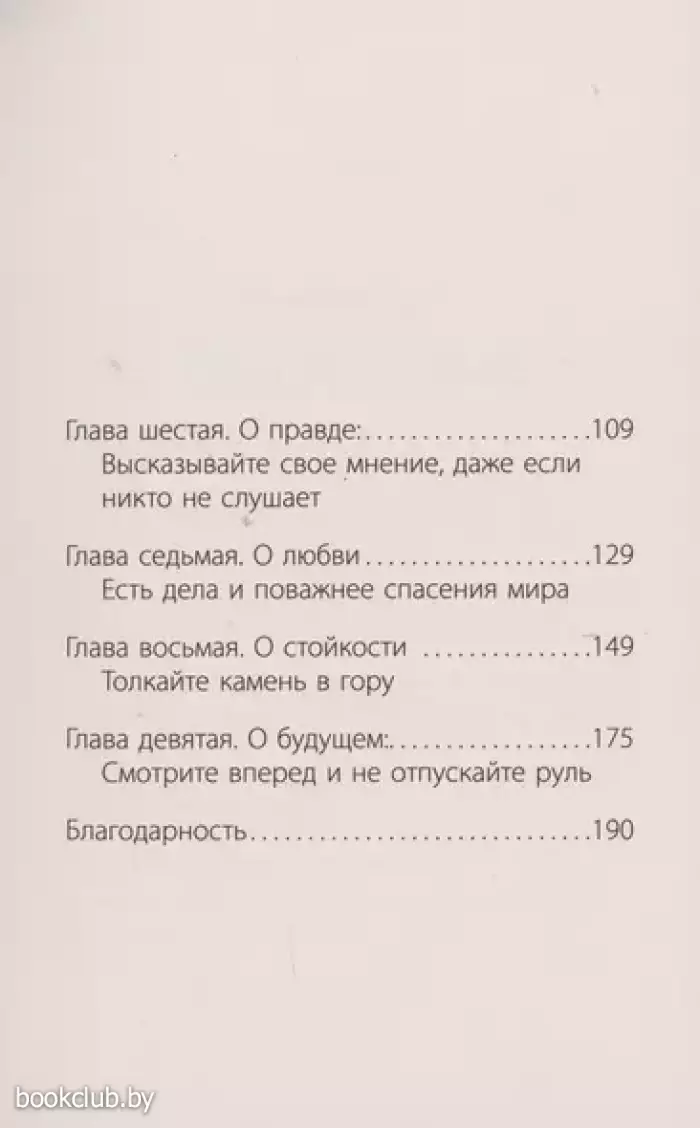 "Ищите маленькие радости во всем, что вас окружает, и это послужит хорошей опорой, как масло, которое подливают в огонь, чтобы он не погас. Говорите себе, что счастье не в том, чтобы довольствоваться малым, а в том, чтобы стремиться к далеким и несбыточным целям: найти работу мечты, дом мечты или встретить любовь всей своей жизни. Чтобы найти радость, нужно смотреть по сторонам. Счастье вам ничем не обязано. Это не человек или система, на которую можно злиться