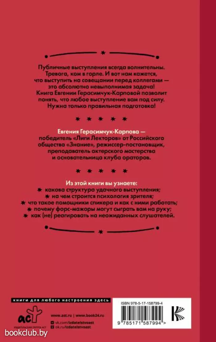 Потеют руки, к горлу подступает ком, а выступить на совещании перед коллегами кажется невыполнимой задачей? Знакомые ощущения? Книга Евгении Герасимчук-Карповой позволит понять, что любое выступление вам под силу. Нужна только правильная подготовка! На чем строится психология зрителя, что такое помощники спикера, почему форс-мажоры могут сыграть вам на руку — это и многое другое вы можете прочитать в этом руководстве.
