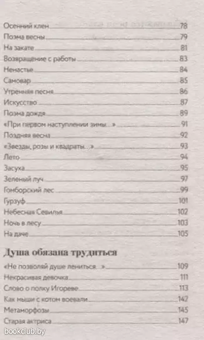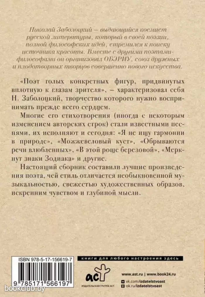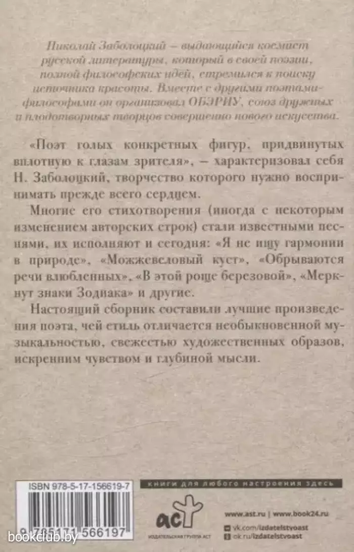 Николай Заболоцкий – выдающийся космист русской литературы, который в своей поэзии, полной философских идей, стремился к поиску источника красоты. Вместе с другими поэтами-философами он организовал ОБЭРИУ, союз дружных и плодотворных творцов совершенно нового искусства. «Поэт голых конкретных фигур, придвинутых вплотную к глазам зрителя», — характеризовал себя Н. Заболоцкий, творчество которого нужно воспринимать прежде всего сердцем. Многие его стихотворения (иногда с некоторым изменением авторских строк) стали известными песнями, их исполняют и сегодня: « Я не ищу гармонии в природе», «Можжевеловый куст», «Обрываются речи влюбленных», «В этой роще березовой», «Меркнут знаки Зодиака» и другие. Настоящий сборник составили лучшие произведения поэта, чей стиль отличается необыкновенной музыкальностью, свежестью художественных образов, искренним чувством и глубиной мысли.