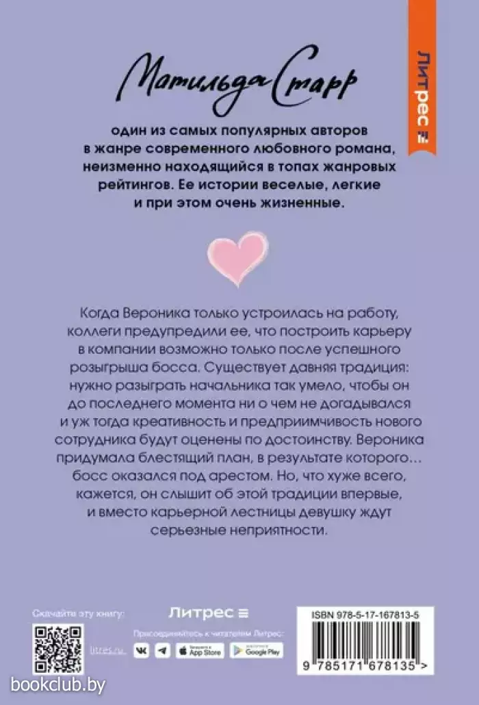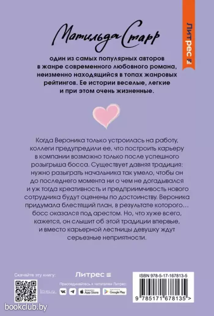 Когда Вероника только устроилась на работу, коллеги предупредили ее, что построить карьеру в компании возможно только после успешного розыгрыша босса. Существует давняя традиция: нужно разыграть начальника так умело, чтобы он до последнего момента ни о чем не догадывался, и уж тогда креативность и предприимчивость нового сотрудника будут оценены по достоинству. Вероника придумала блестящий план, в результате которого… босс оказался под арестом. Но, что хуже всего, кажется, он слышит об этой традиции впервые, и вместо карьерной лестницы девушку ждут серьезные неприятности.