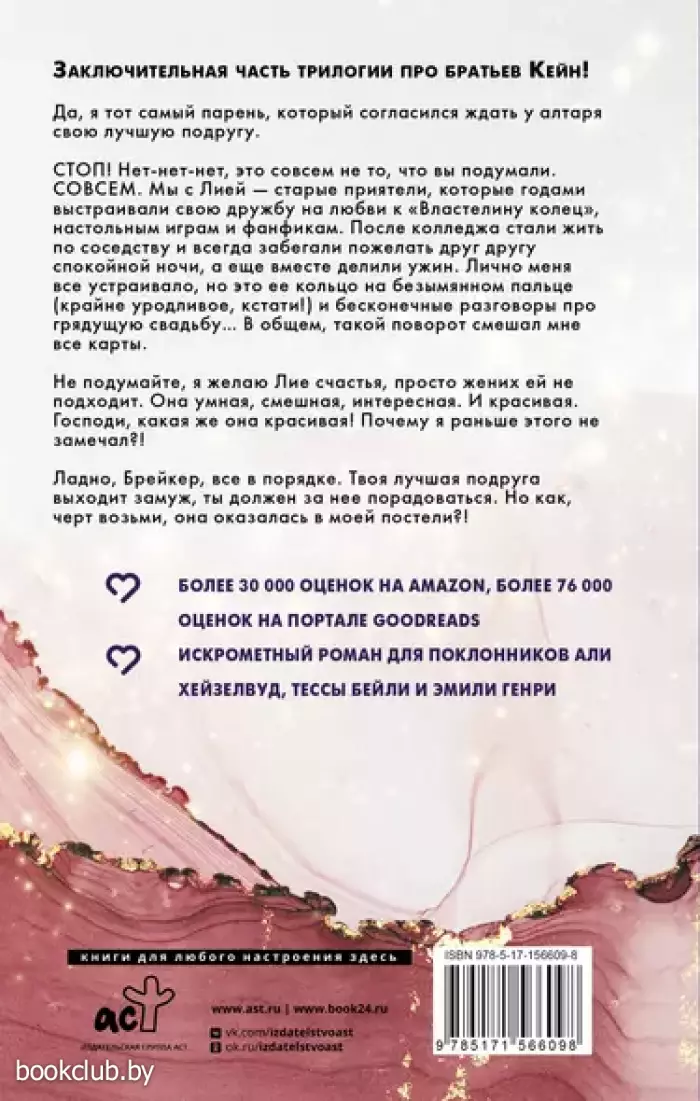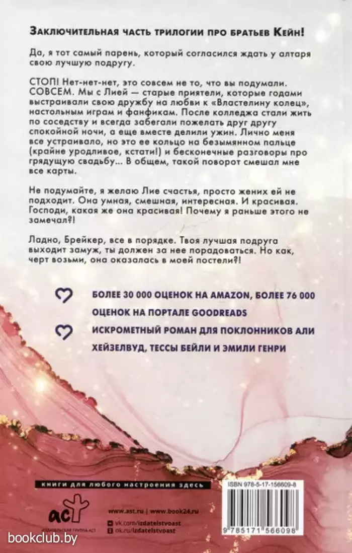 Да, я тот самый парень, который согласился ждать у алтаря свою лучшую подругу. СТОП! Нет-нет-нет, это совсем не то, что вы подумали. СОВСЕМ. Мы с Лией — старые приятели, которые годами выстраивали свою дружбу на любви к «Властелину колец», настольным играм и фанфикам. После колледжа стали жить по соседству и всегда забегали пожелать друг другу спокойной ночи, а еще вместе делили ужин. Лично меня все устраивало, но это ее кольцо на безымянном пальце (крайне уродливое, кстати!) и бесконечные разговоры про грядущую свадьбу… В общем, такой поворот смешал мне все карты. Не подумайте, я желаю Лие счастья, просто жених ей не подходит. Она умная, смешная, интересная. И красивая. Господи, какая же она красивая! Почему я раньше этого не замечал?! Ладно, Брейкер, все в порядке. Твоя лучшая подруга выходит замуж, ты должен за нее порадоваться. Но как, черт возьми, она оказалась в моей постели?!
