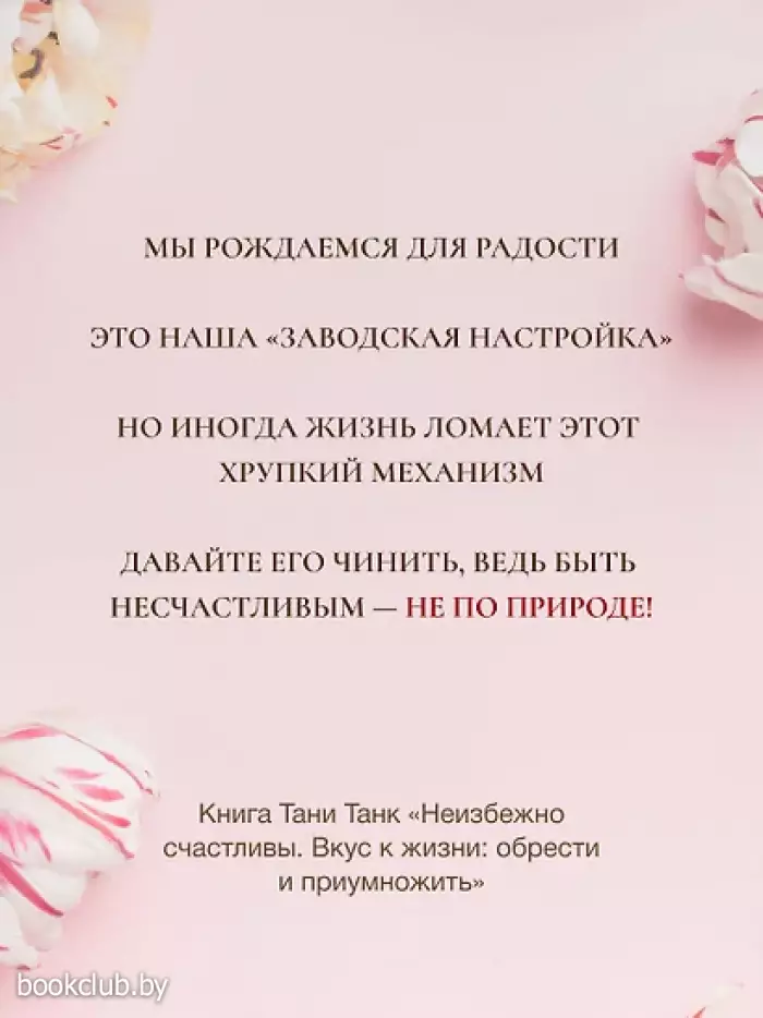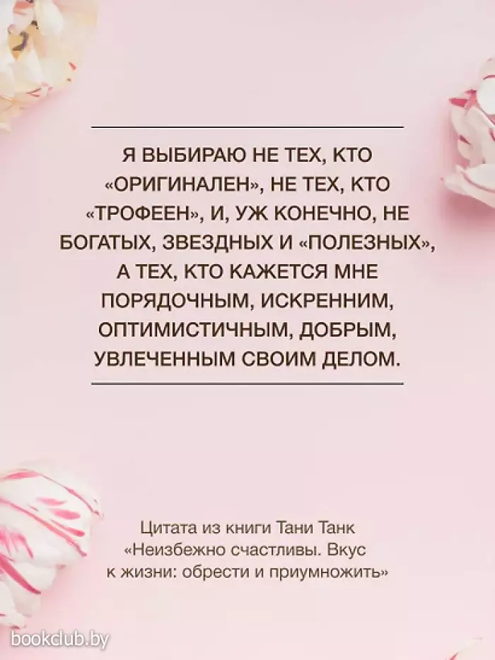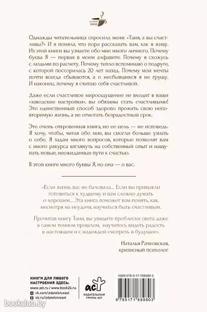 Однажды читательница спросила меня: «Таня, а вы счастливы?» И я поняла, что пора рассказать вам, как я живу. Из этой книги вы узнаете обо мне много личного. Почему буква Я — первая в моем алфавите. Почему я схожусь с людьми по расчету. Почему тепло вспоминаю о подруге, с которой поссорилась 20 лет назад. Почему и кому я завидовала. Почему мои мечты почти всегда сбываются, а о несбывшихся я не грущу. И наконец, почему я считаю себя счастливой. Даже если счастливое мироощущение не входит в ваши «заводские настройки», вы обязаны стать счастливыми! Это единственный способ здорово прожить свою неповторимую жизнь, а не отмотать безрадостный срок. Это очень откровенная книга, но ее цель — не исповедь. Я хочу, чтобы, читая обо мне, вы смогли больше узнать о себе. Я задам много вопросов, которые позволят вам с иного ракурса взглянуть на собственный опыт и нащупать новые, неожиданные пути к счастью. В этой книге много буквы Я, но она — о вас.