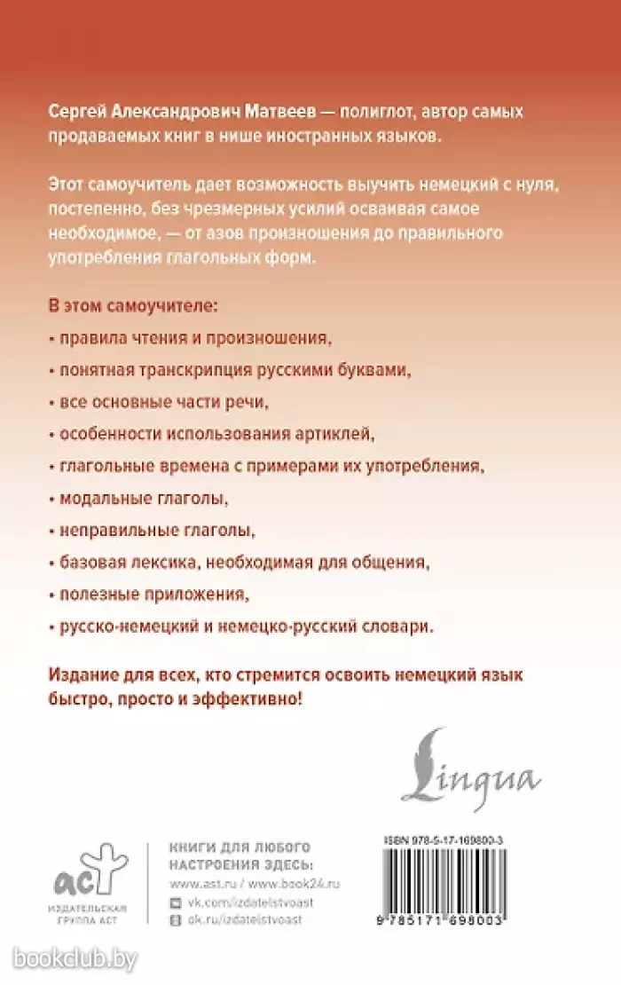 Проработав этот самоучитель, читатель освоит язык на уровне А2, научится понимать немецкую речь на слух, читать несложные тексты, а также общаться на бытовые темы.