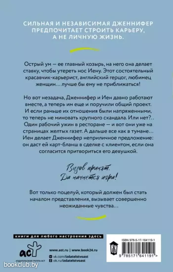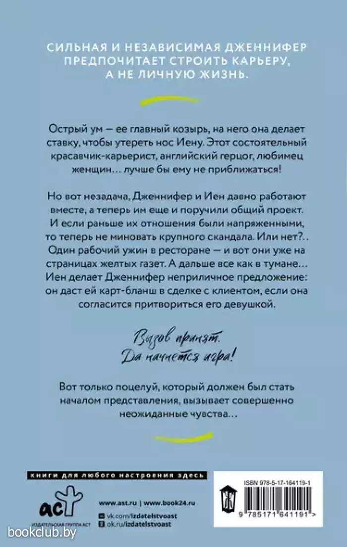 Сильная и независимая Дженнифер предпочитает строить карьеру, а не личную жизнь. Острый ум — ее главный козырь, на него она делает ставку, чтобы утереть нос Иену. Этот состоятельный красавчик-карьерист, английский герцог, любимец женщин… лучше бы ему не приближаться! Но вот незадача, Дженнифер и Иен давно работают вместе, а теперь им еще и поручили общий проект. И если раньше их отношения были напряженными, то теперь не миновать крупного скандала. Или нет?.. Один рабочий ужин в ресторане — и вот они уже на страницах желтых газет. А дальше все как в тумане… Иен делает Дженнифер неприличное предложение: он даст ей карт-бланш в сделке с клиентом, если она согласится притвориться его девушкой. Вызов принят. Да начнется игра! Вот только поцелуй, который должен был стать началом представления, вызывает совершенно неожиданные чувства...