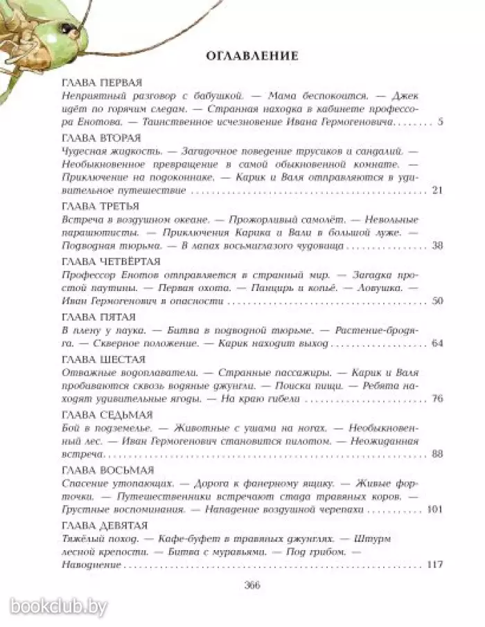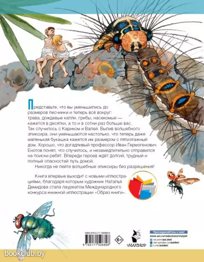 Представьте, что вы уменьшились до размеров песчинки и теперь всё вокруг: трава, дождевые капли, грибы, насекомые — кажется в десятки, а то и в сотни раз больше вас. Так случилось с Кариком и Валей. Выпив волшебного эликсира, они уменьшаются настолько, что теперь даже маленькая букашка кажется им размером с пятиэтажный дом. Хорошо, что догадливый профессор Иван Гермогенович Енотов понял, что случилось, и незамедлительно отправился на поиски ребят. Впереди героев ждёт долгий, трудный и полный опасностей путь домой.